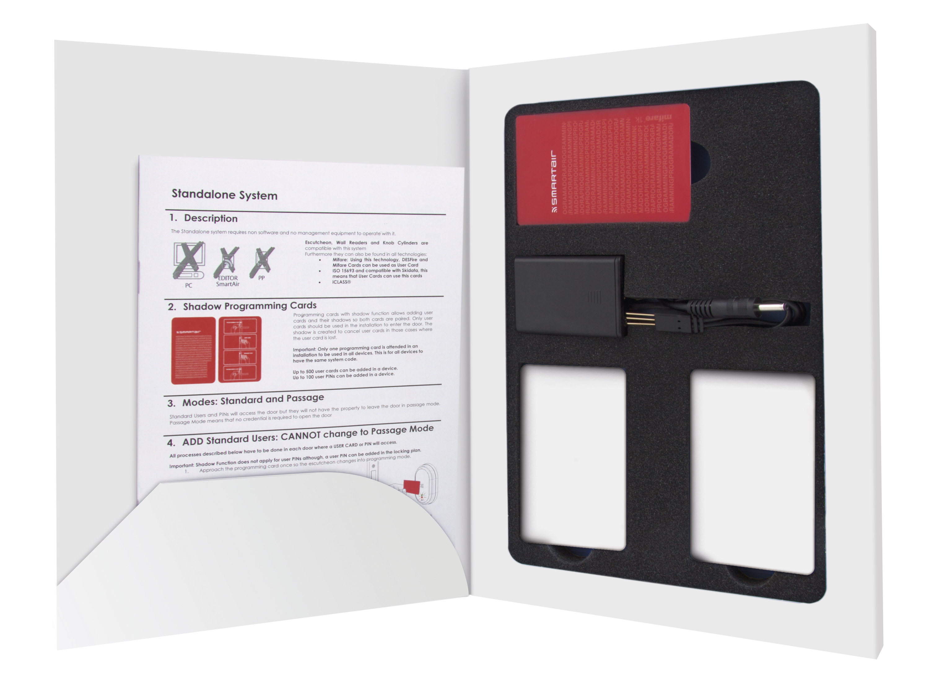• Das SMARTair Stand Alone System ist eine einfache und kostengünstige Lösung für die Zutrittskontrolle. Es benötigt keine Software oder spezielle Ausrüstung. Für die Einrichtung sind nur SMARTair Türkomponenten mit RFID-Leser und optionalem PIN-Pad, eine Programmierkarte und die Identmedien der Benutzer erforderlich. Innerhalb weniger Minuten können Sie Berechtigungen hinzufügen und löschen.