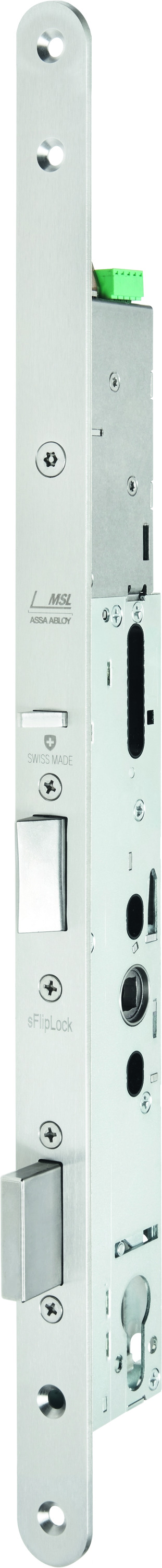 - Das drückergesteuerte Einsteckschloss sFlipLock e-access hat keine Panikfunktion aber eine durchgehende Drückernuss. Typischerweise wird auf beiden Türseiten ein Beschlag mit Türdrückern montiert. Das Entriegeln von Aussen als auch von Innen erfolgt via einem elektronischen Impuls, Fingerprint, Taster, Badge oder Zeitschaltuhr, dabei wird der Aussendrücker bzw. Innendrücker angekoppelt und der Riegel zunächst bis auf 5 mm eingezogen. Über den angekoppelten Türdrücker wird anschließend die Kippfalle freigegeben und das Schloss vollständig entriegelt. Bei verriegelter Tür ist eine Notöffnung von aussen oder innen über den Zylinder jederzeit möglich. Wenn die Türe schliesst, verriegelt das Schloss automatisch wieder (Selbstverriegelung).Dieses Schloss gibt es immer in Kombination mit einer Auswertesteuerung (AWS), sie dient dazu alle Kontakte des Motorschlosses sFlipLock e- access auswerten zu können. Das Motorschloss kann somit für definierte Zeiten geöffnet, geschlossen, in Tagstellung gefahren oder komplett verriegelt (gesperrt) werden. Die Versorgungsspannung für das Motorschloss wird ebenfalls von der AWS zur Verfügung gestellt. Im Notfallmodus (Netzausfall / Auslösung Brandmeldezentrale) wird das Motorschloss im geöffneten Zustand automatisch durch einen integrierten Puffer-Kondensator verriegelt. Beim separaten Sperreingang (verriegelt) werden alle Eingangssignale abgekoppelt, somit fährt das Motorschloss automatisch in Verrieglung.