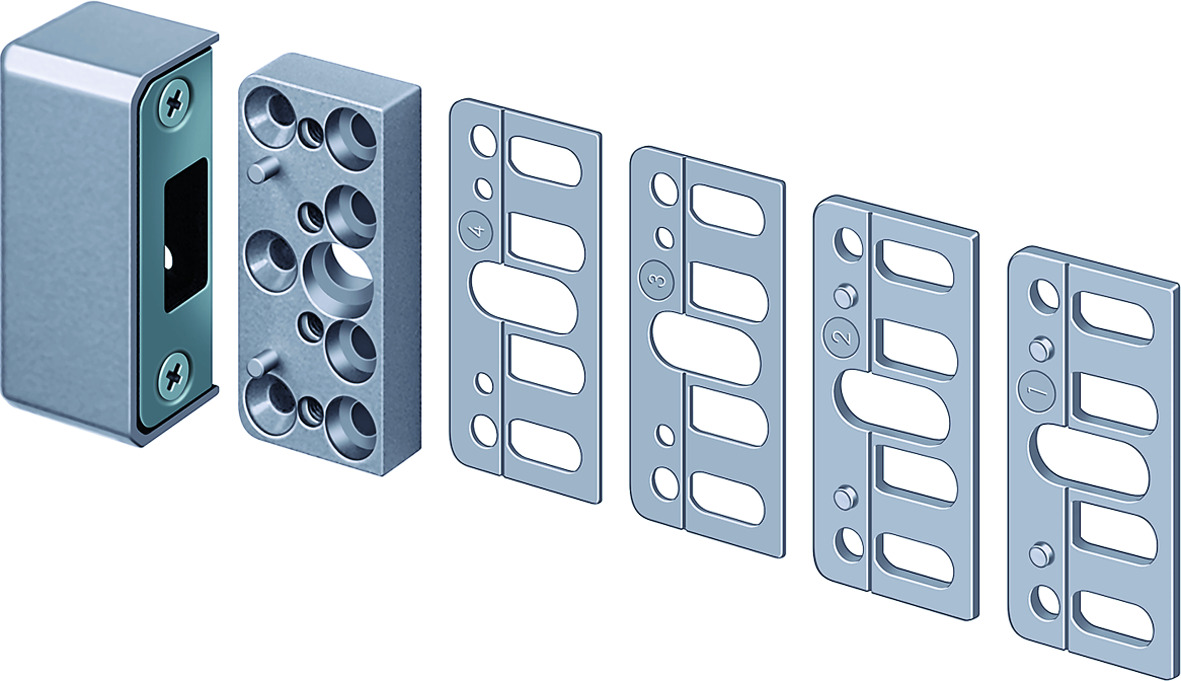 • 1 Schließkasten mit 5 Abstandsplatten (2x1mm, 2x3mm, 1x13mm)