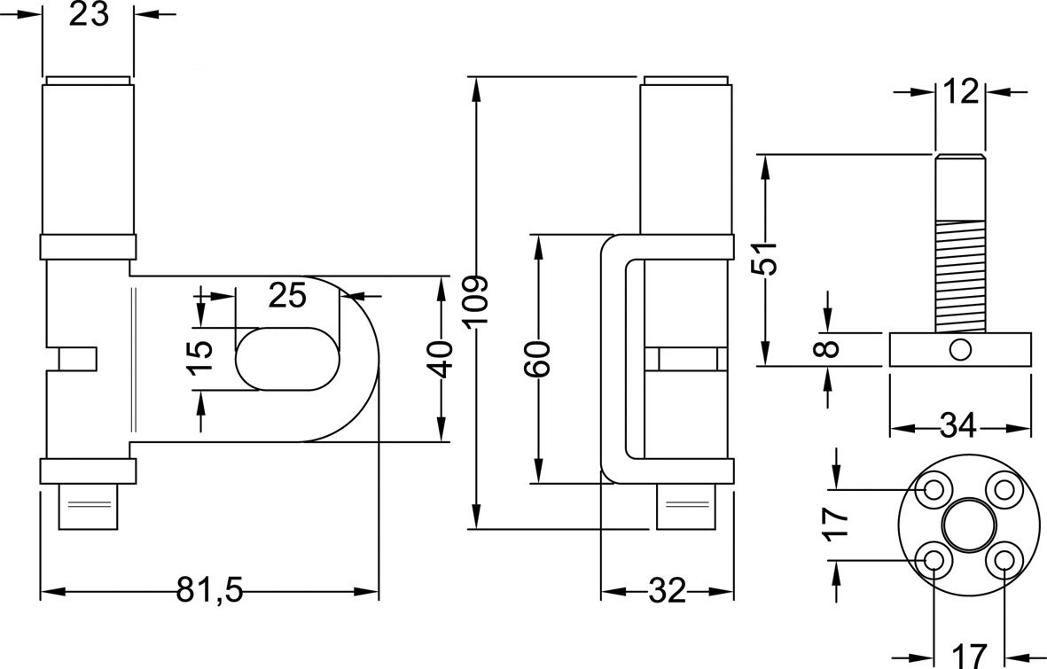 - 1 Fenstersicherung Jumbo mit Befestigungsmaterial (2 Unterlegplatten 3 mm, 1 Sicherungsstift, Schrauben, Gewindebolzen, Anschraubrosette, Innensechskantschlüssel)