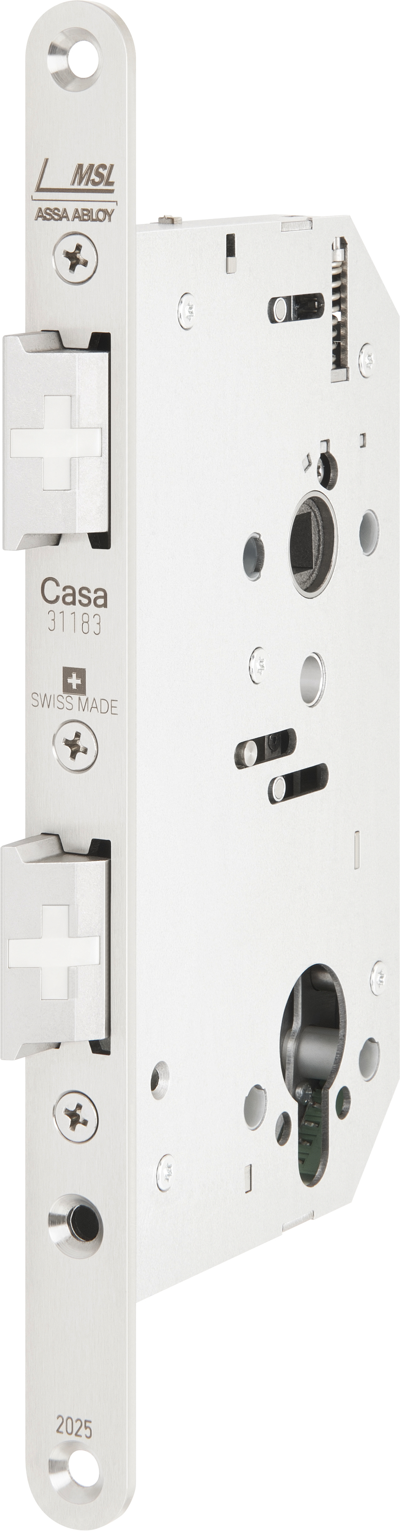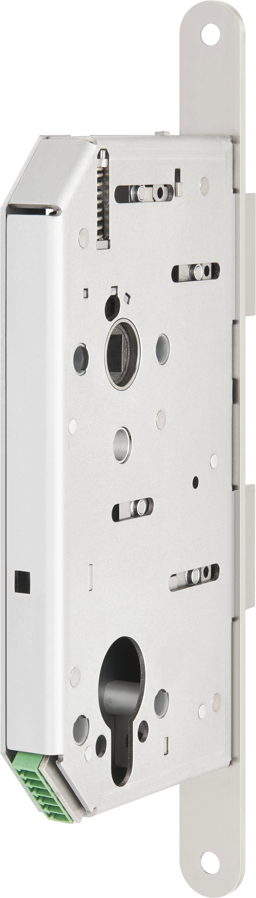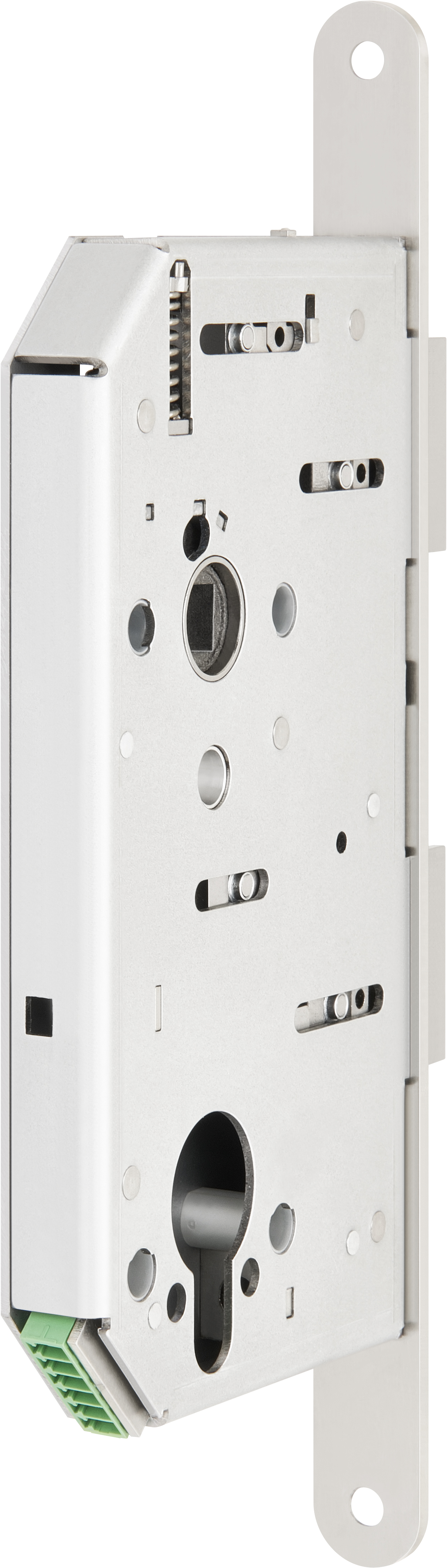 - Bei diesem Zweifallen-Panik-Einsteckschloss ist auf der Tür-Innenseite ein Türdrücker, Paniktür-Beschlag oder eine Pushbar angebracht. Auf der Tür-Aussenseite ist ebenfalls ein Türdrücker angebracht. Im verschlossenen Zustand kann die Tür nicht von aussen, jedoch von innen immer über den Türdrücker, Paniktürbeschlag oder Pushbar, geöffnet werden (Panikfunktion). Bei einer Drückerbetätigung von aussen wird nur die obere Falle eingezogen und verhindert so ein Begehen der Tür. Durch die Betätigung der Wechselfunktion über den Schlüssel wird die obere und untere Falle zeitgleich eingezogen und ermöglicht ein Begehen der Tür von aussen. Der im Schloss integrierte Drücker- und Zylinderkontakt ermöglicht die Abgabe eines elektronischen Impulses an das Fluchttürsteuerterminal, wodurch eine Kurzzeitfreigabe erfolgt. Um die Funktionsfähigkeit mit dem Fluchttüröffner durch unterschiedliche Falzluft gewährleisten zu können, kann die untere Falle stufenweise tiefenverstellt werden ohne Komponenten ausbauen zu müssen.