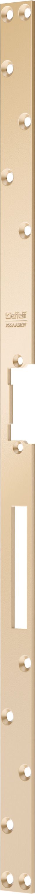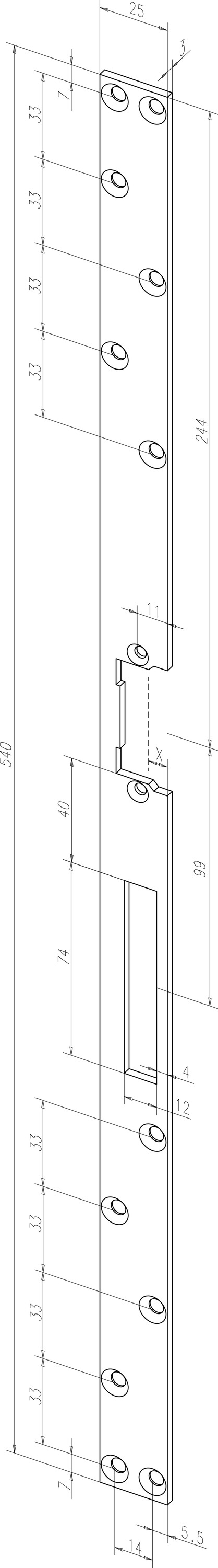 Security flat striking plate with latch bolt aperture and dead bolt cutout.