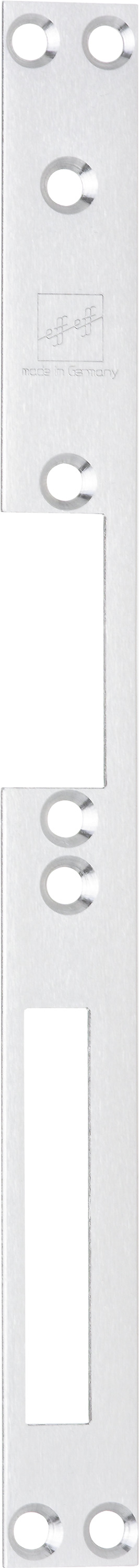 Flat strike plate with latch bolt aperture and deadbolt cutout.