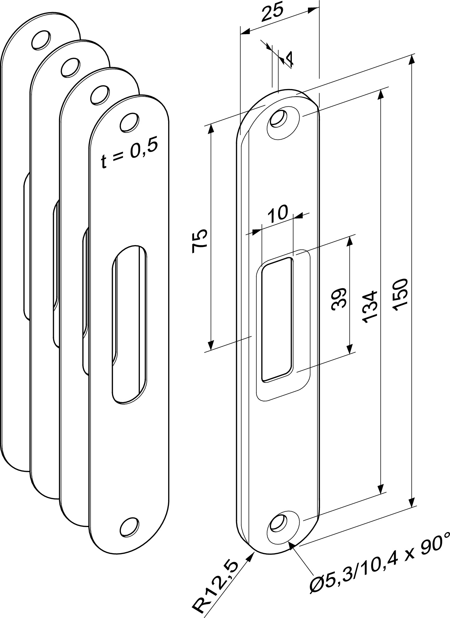 Dimension | 150 x 25 x 4 mm (contrepartie) ; 150 x 25 x 0,5 mm (entretoise) |
